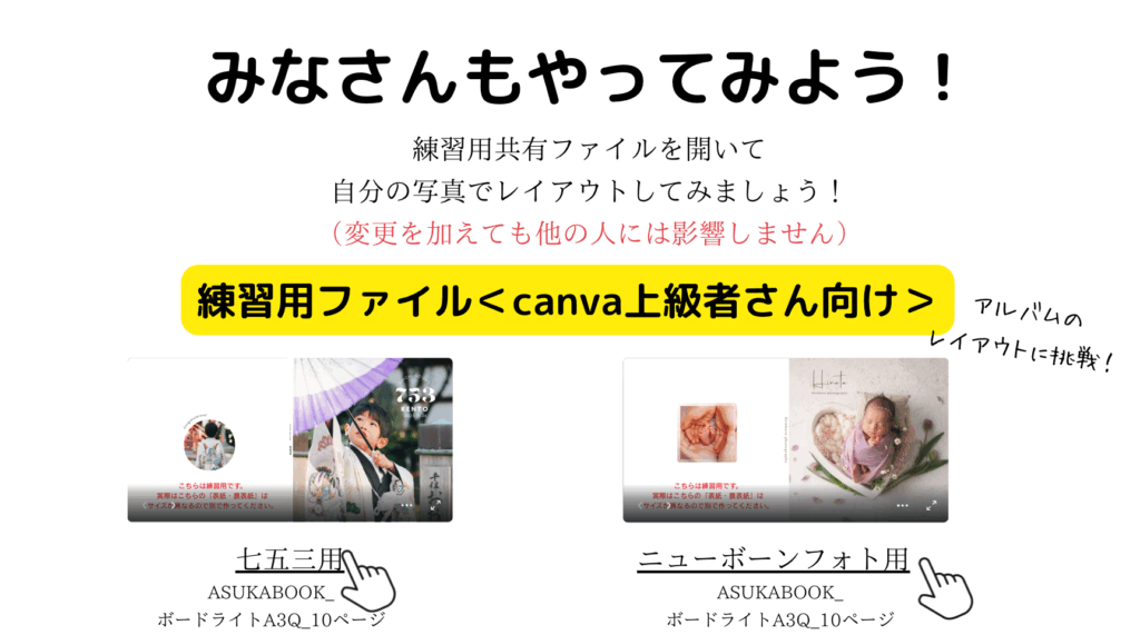 初心者用・中級者用・上級者用、とCanvaの習熟度によってレベル分けしたアルバムテンプレートを使って自分の写真を当てはめていきます。
